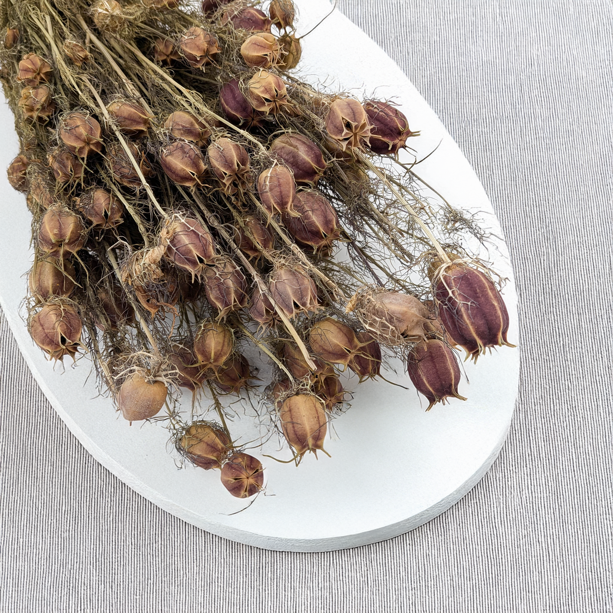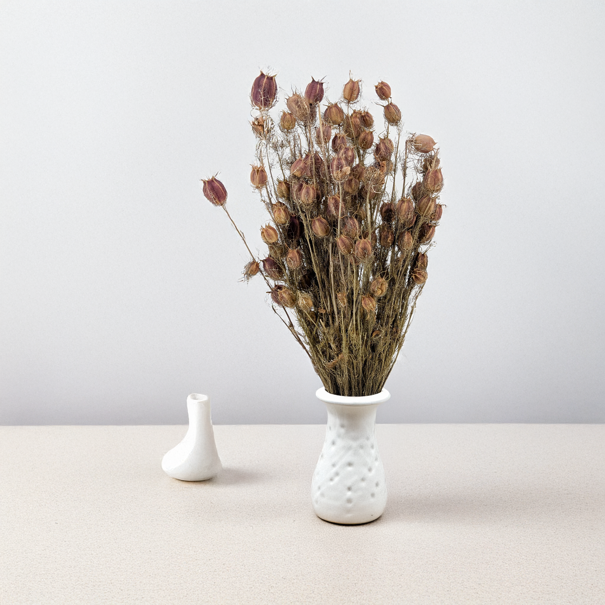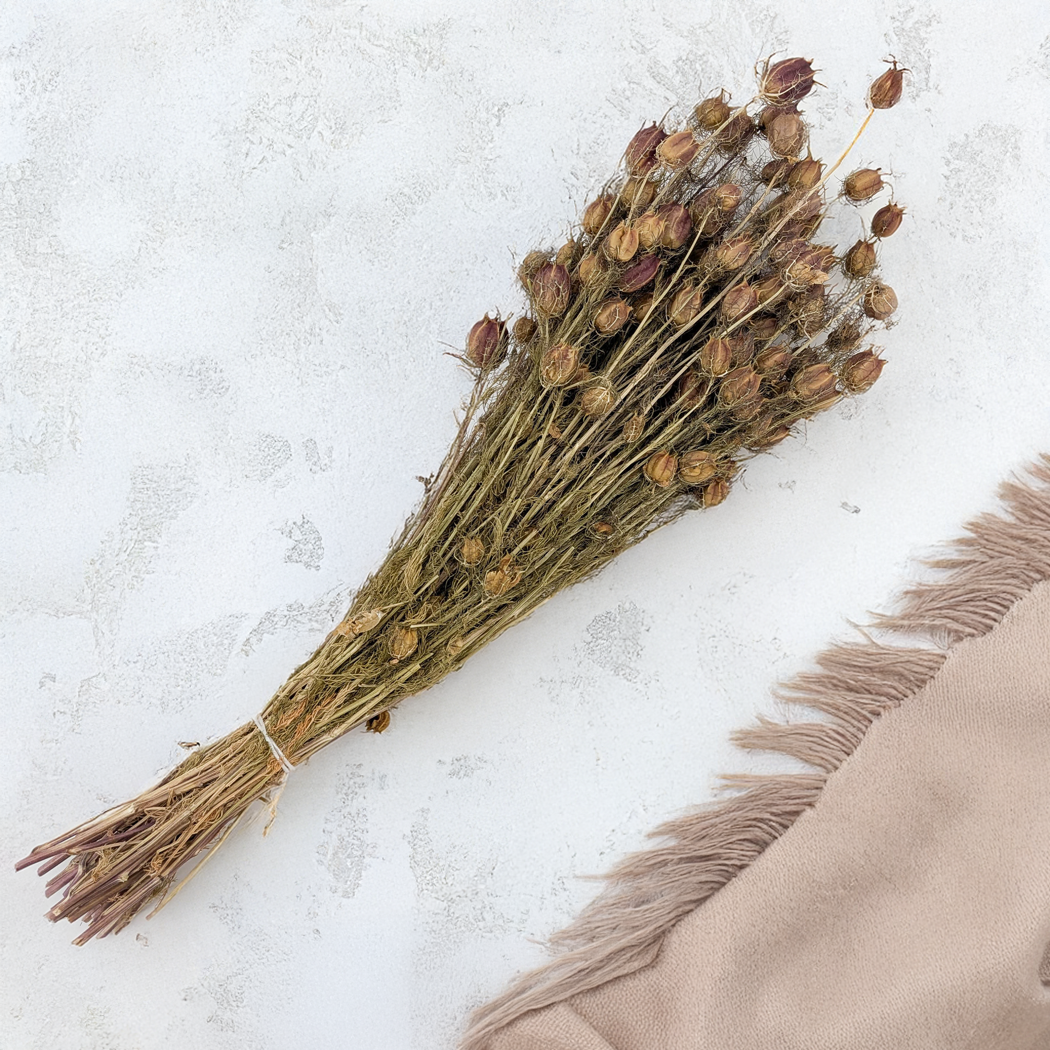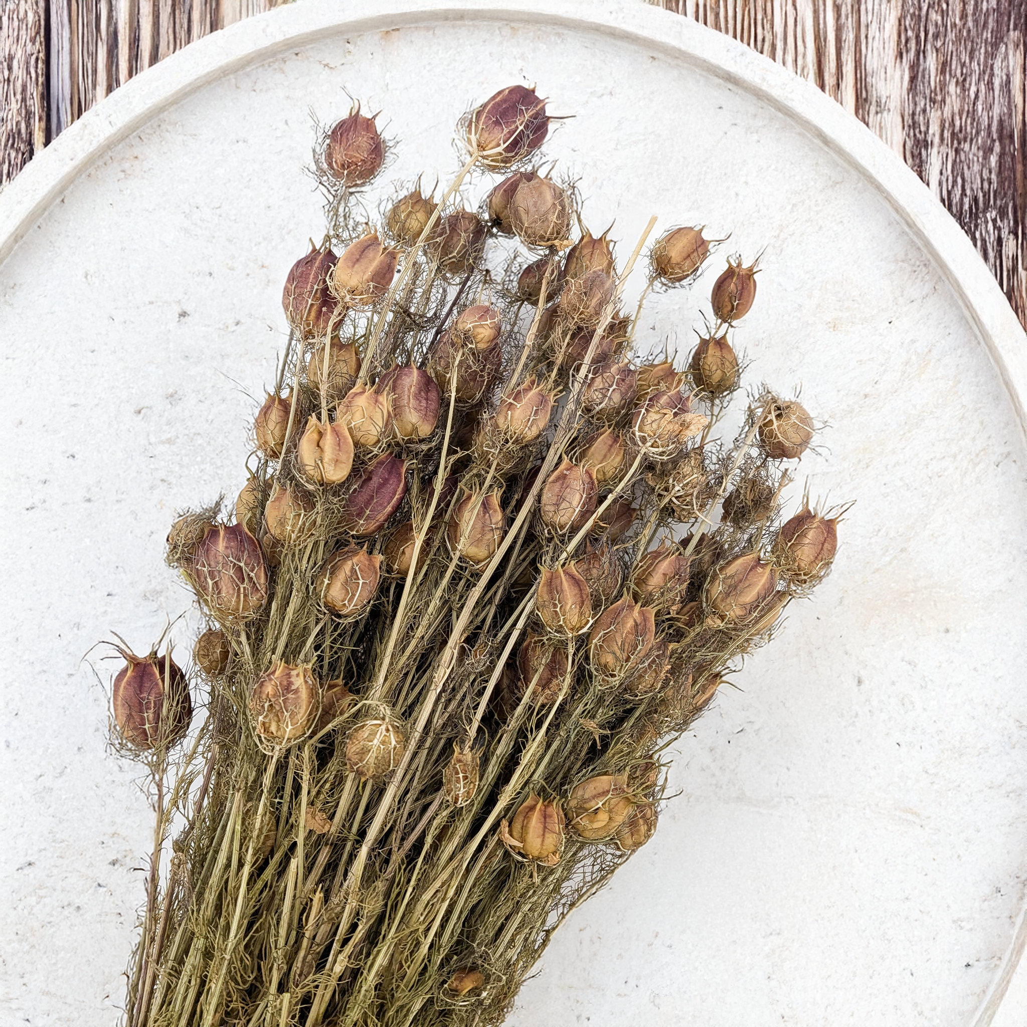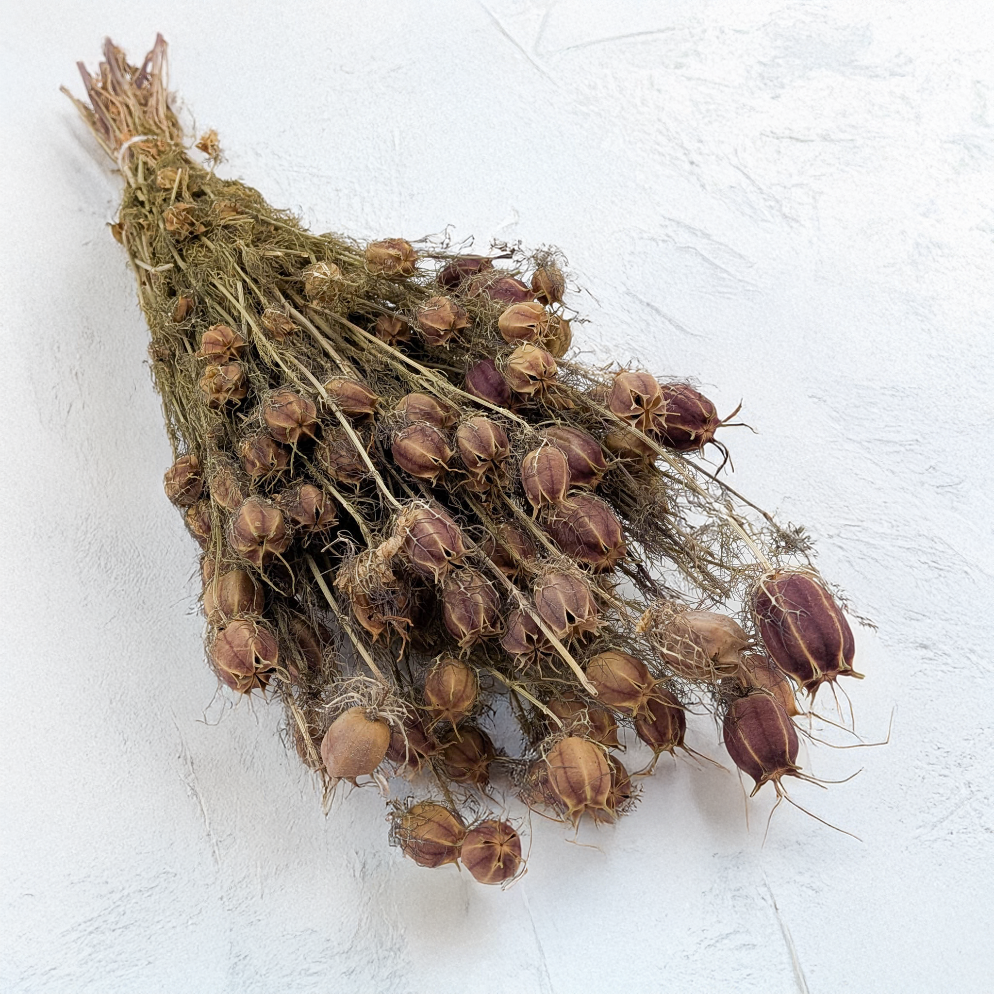 Suszony kwiat czarnuszki o pięknych, dużych, czerwono-bordowych, barwionych gniazdach nasiennych. Idealny do suszonych kompozycji florystycznych, naturalnych bukietów i dekoracji wnętrz, w stylu boho oraz rustykalnym.