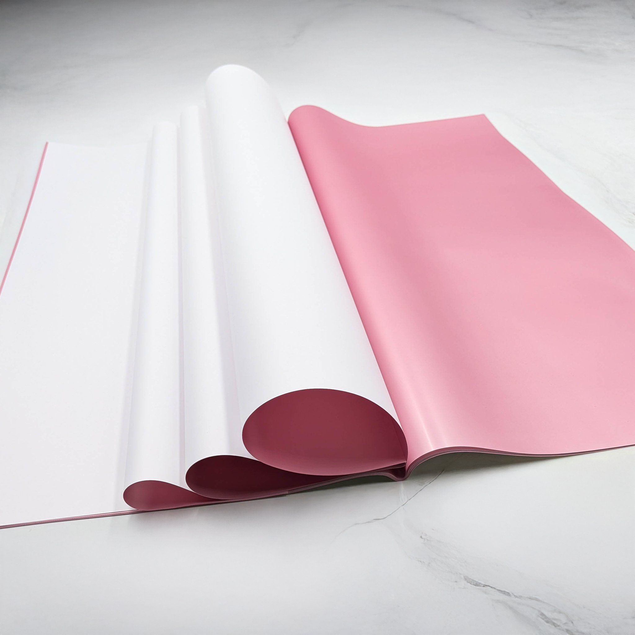 Jednostronne barwienie folii florystycznej na wybrany, jednolity kolor, w połączeniu z drugą stroną w miedziano różowym odcieniu, nadaje jej niepowtarzalny i elegancki wygląd. To dwustronne barwienie sprawia, że folia florystyczna wyróżnia się spośród innych produktów, podkreślając jej ekskluzywny charakter.