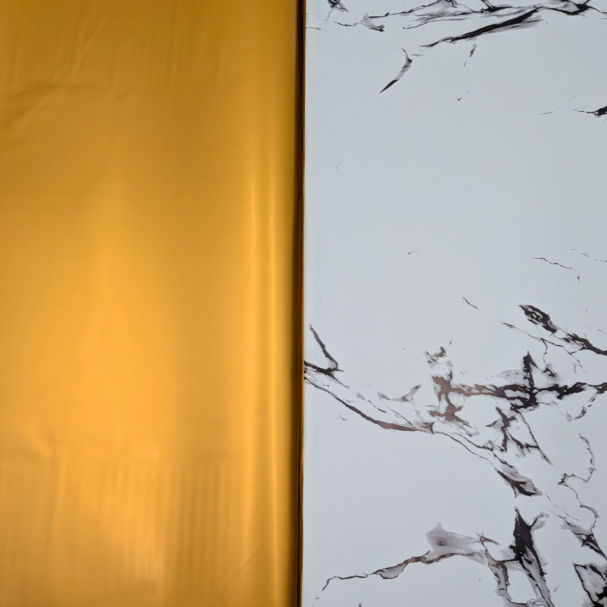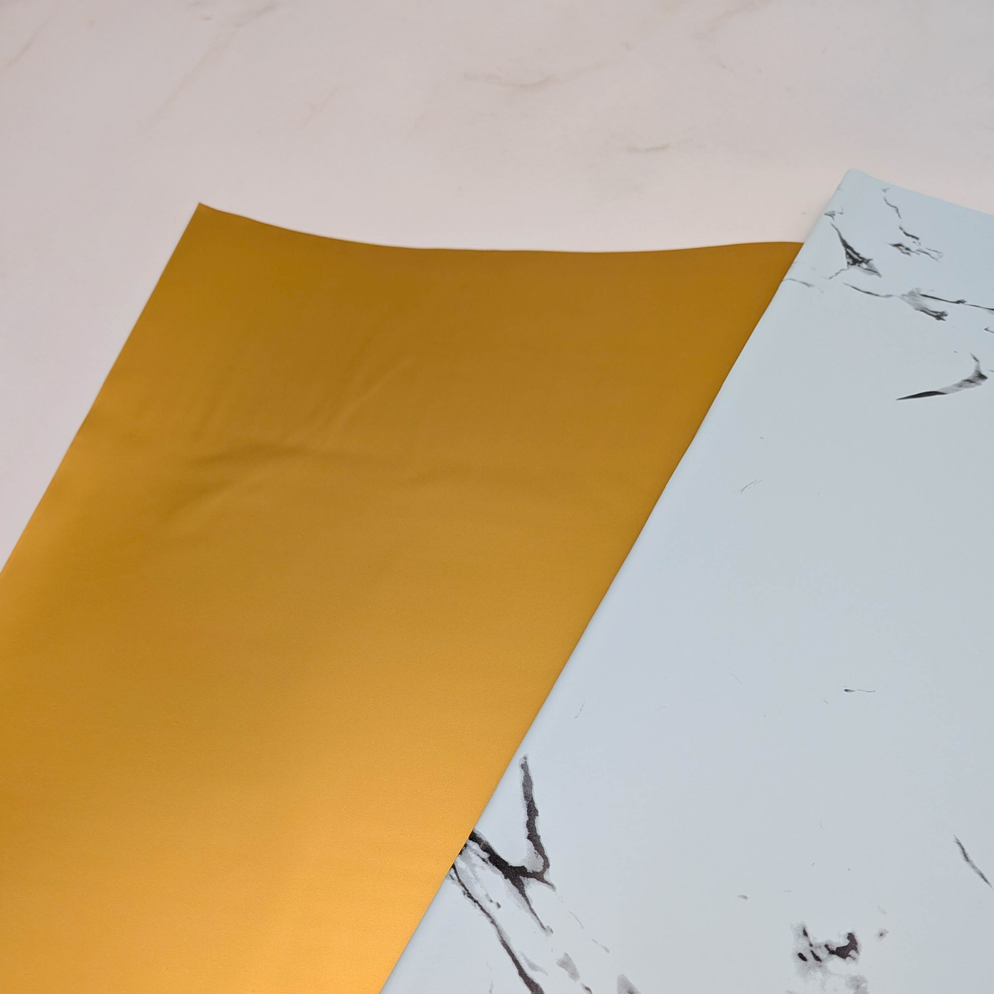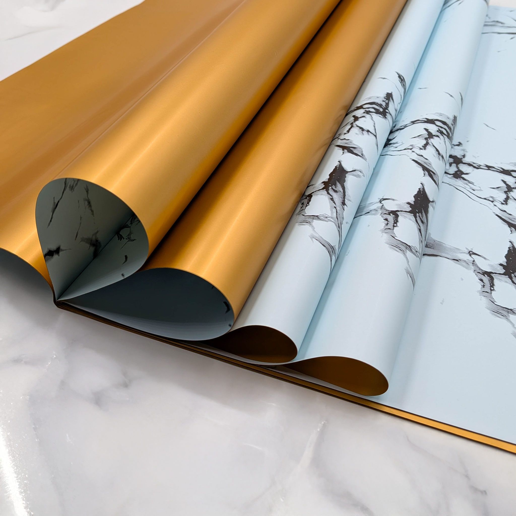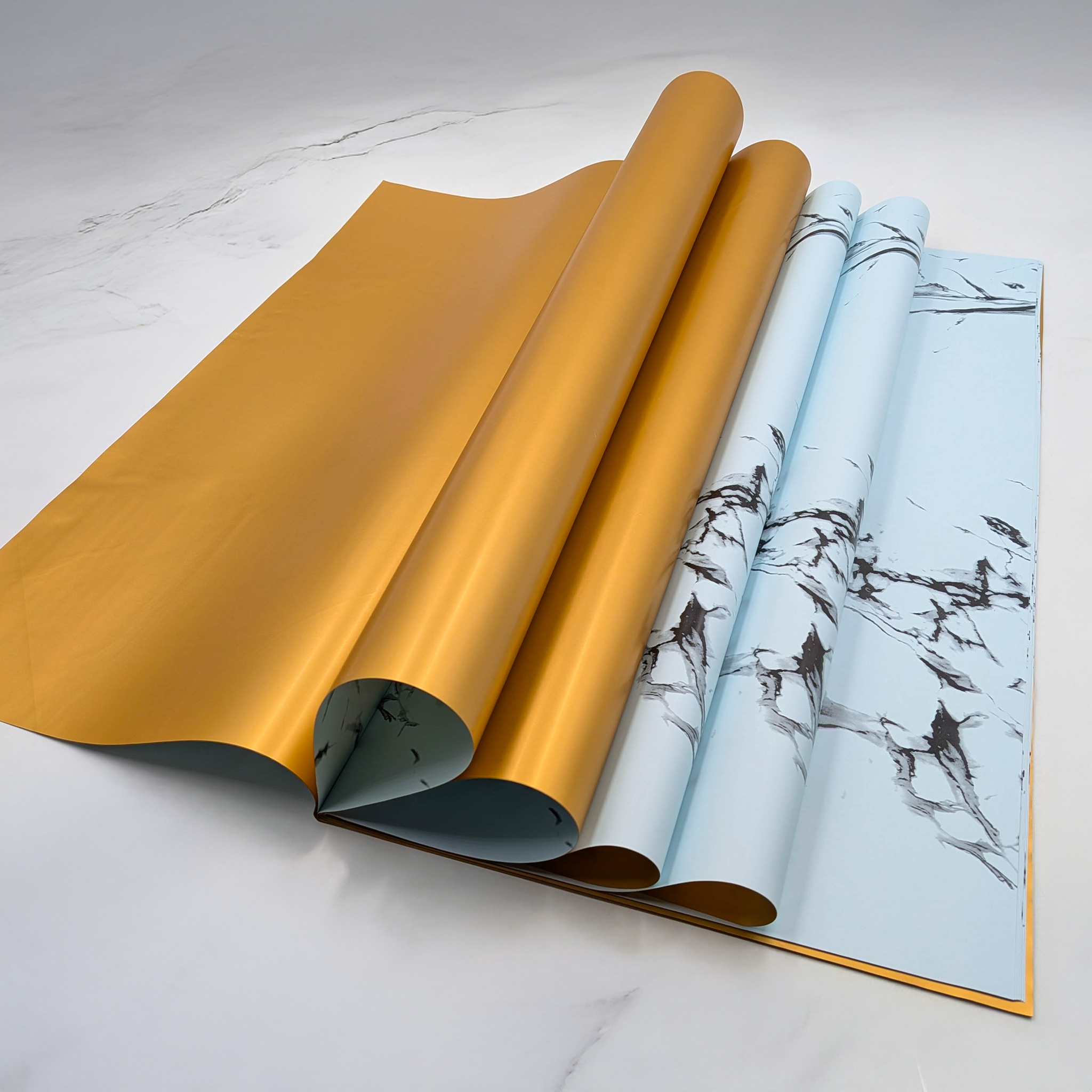 Stone&Shine w kolorze jasnoniebieskim to dwustronna folia florystyczna inspirowana lekkością nieba i spokojem naturalnych barw. Jedna strona arkusza posiada subtelny, marmurowy wzór w delikatnym odcieniu błękitu, druga jest gładka i złota, co tworzy harmonijne, a zarazem wyrafinowane połączenie.