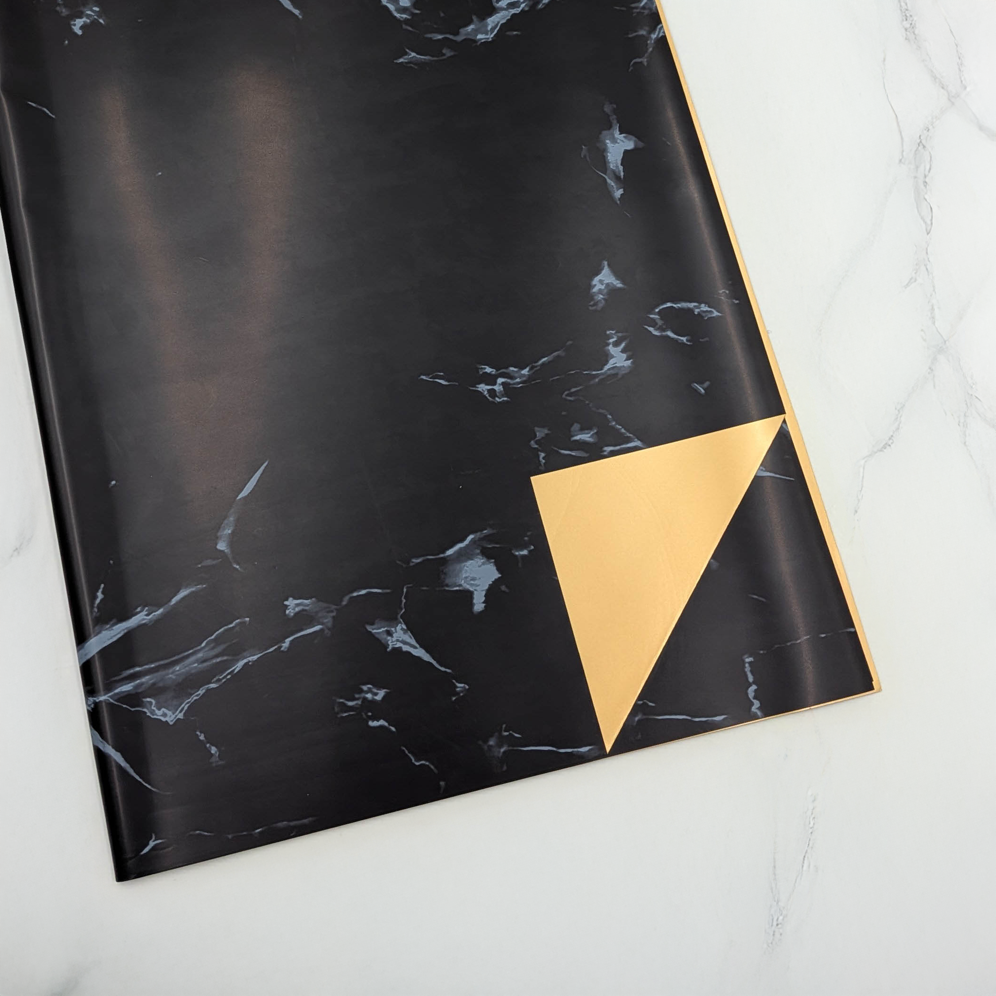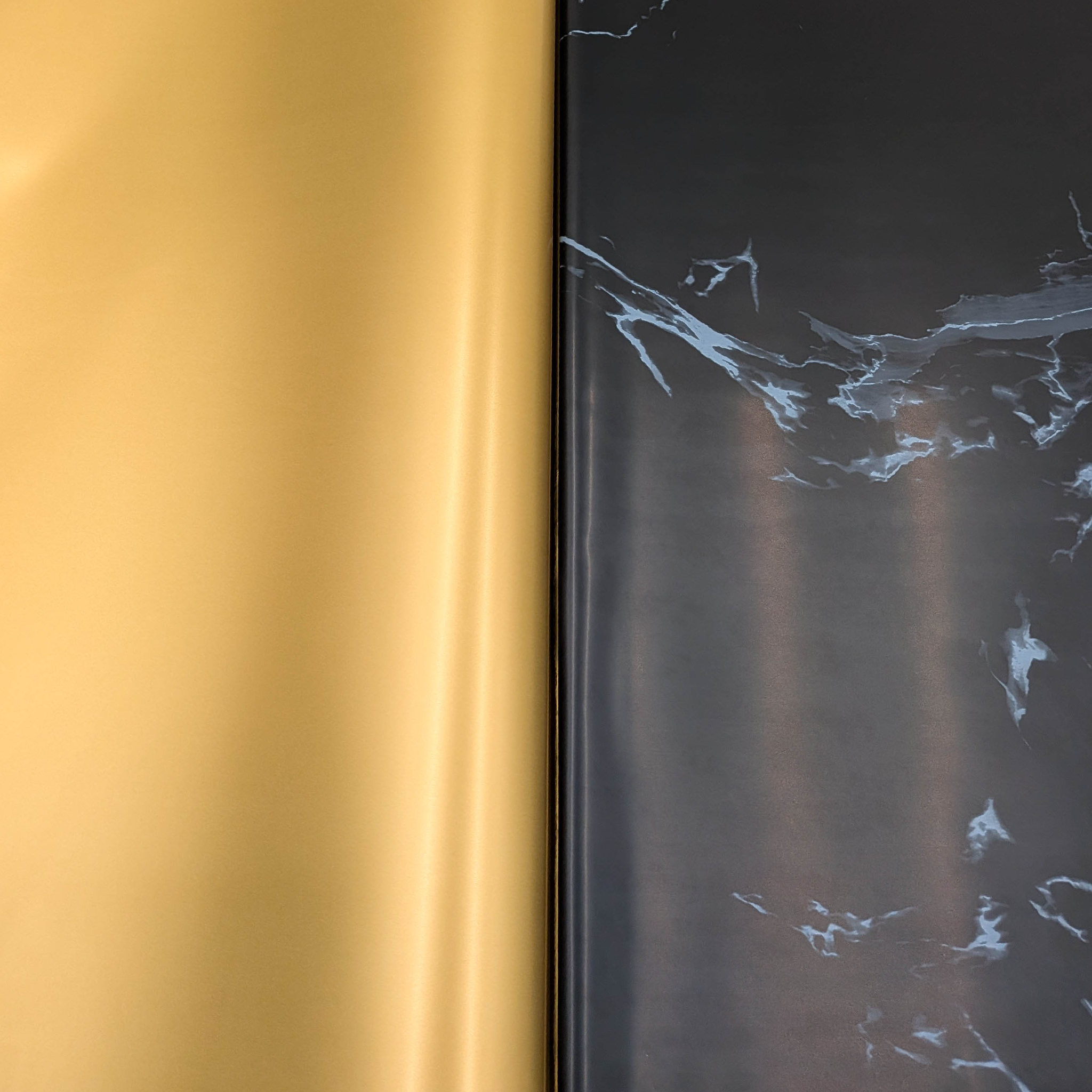 Stone&Shine w kolorze czarnym to dwustronna folia florystyczna stworzona z myślą o wyrazistych, luksusowych kompozycjach. Jedna strona arkusza posiada elegancki, marmurowy wzór w głębokiej czerni, druga jest gładka i złota, co nadaje aranżacjom kontrastowy, prestiżowy charakter.