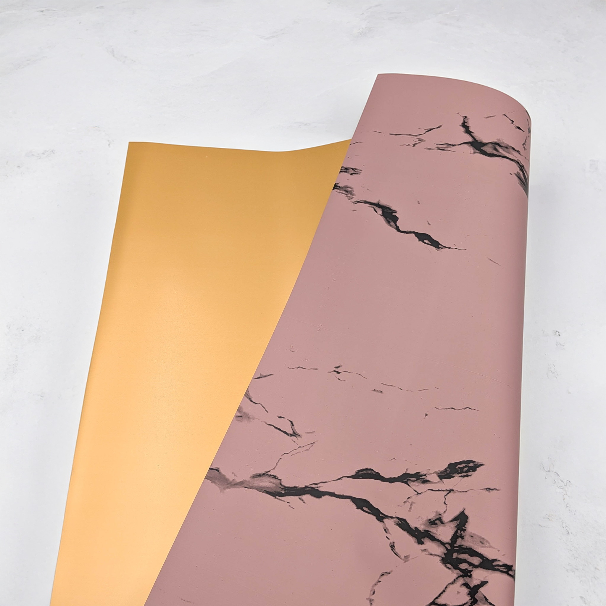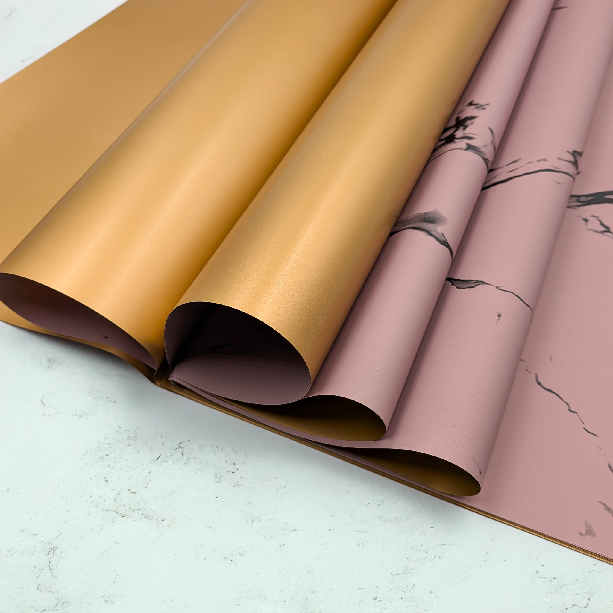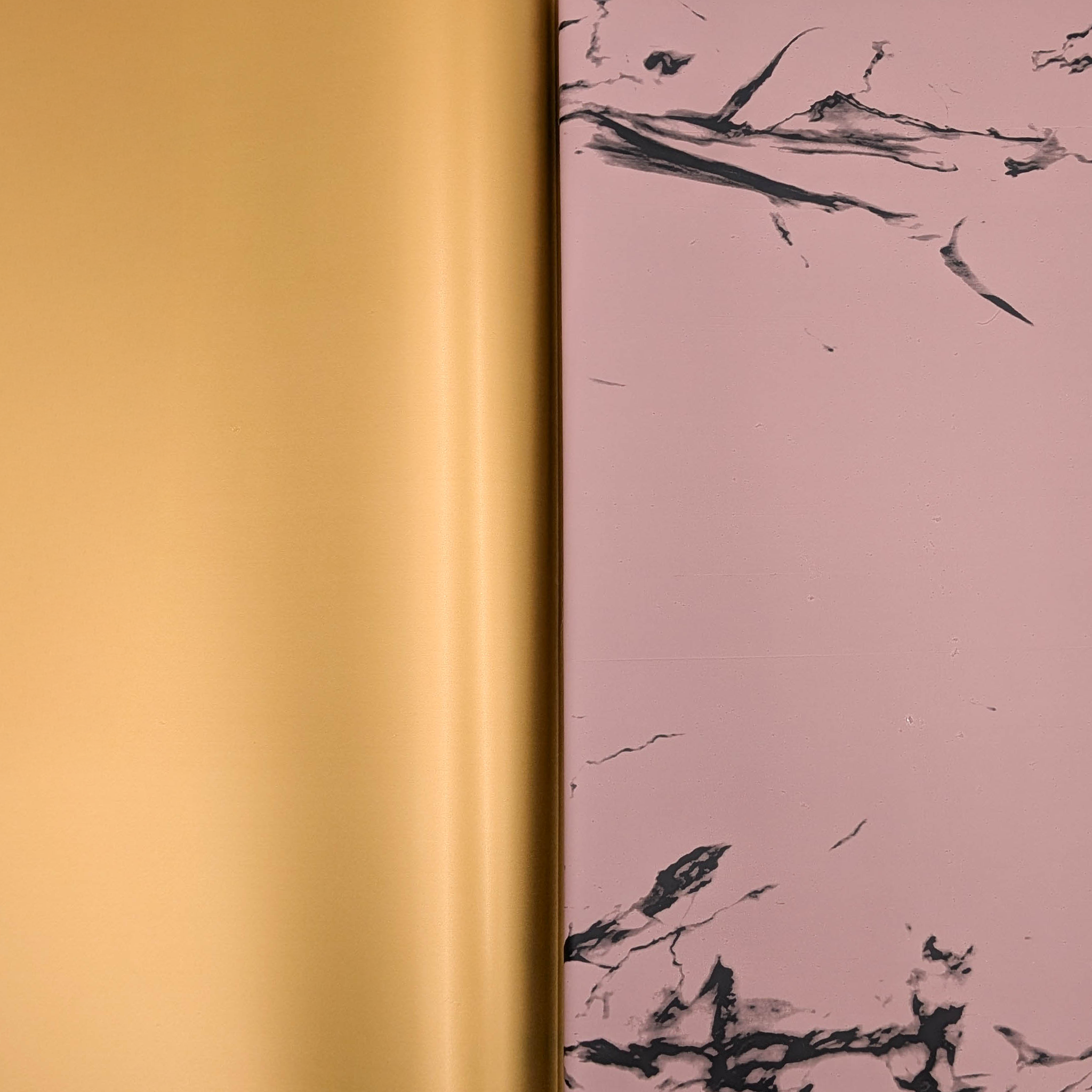 Stone&Shine w kolorze piwoniowego różu to dwustronna folia florystyczna inspirowana delikatnością kwiatów i elegancją nowoczesnych kompozycji. Jedna strona arkusza zdobiona jest subtelnym, marmurowym wzorem w ciepłym, różowym odcieniu inspirowanym płatkami piwonii, druga natomiast jest gładka i złota, tworząc harmonijny kontrast.