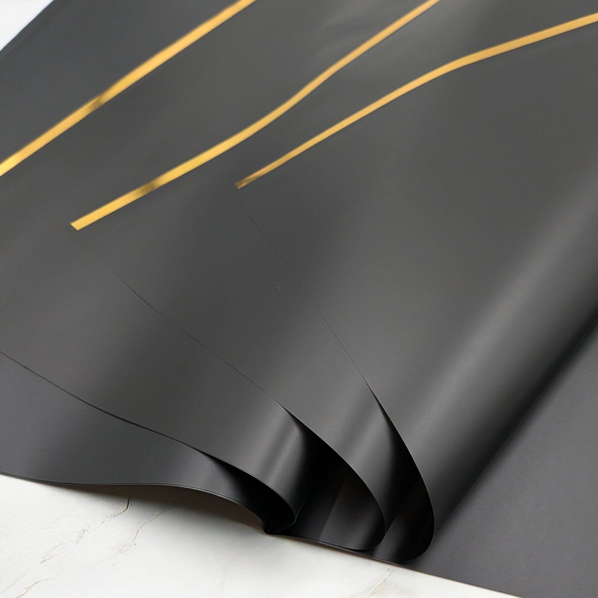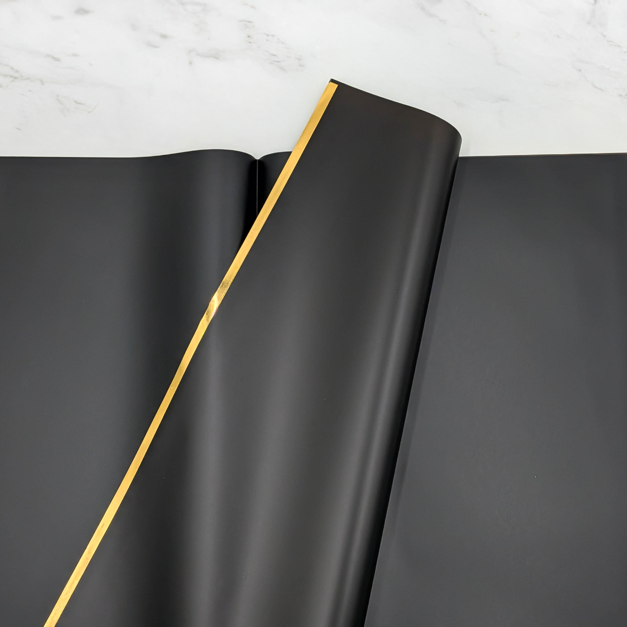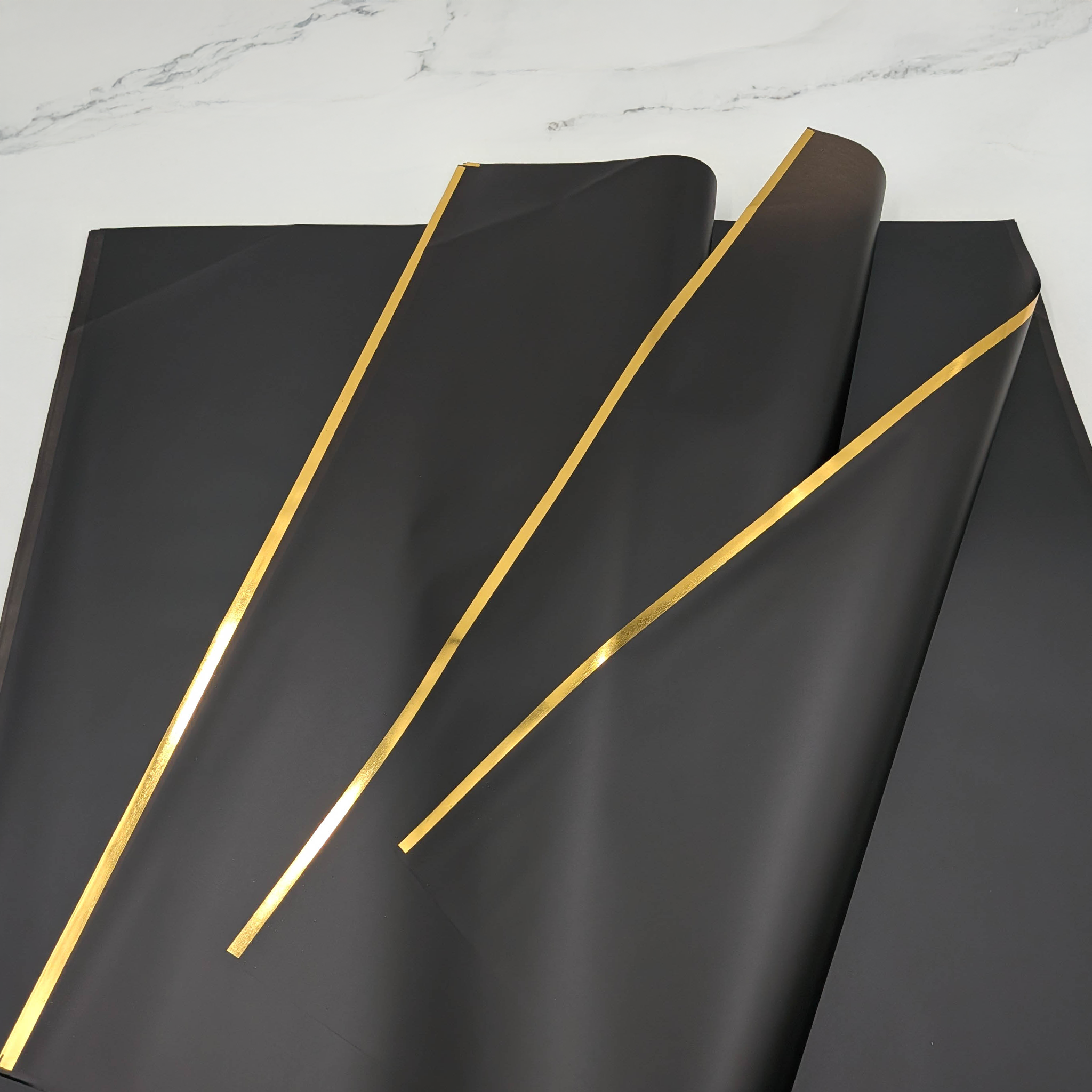 Folia florystyczna w głębokim czarnym kolorze to produkt, który doda dramatyzmu i elegancji każdej kompozycji kwiatowej. Złoty pasek biegnący wzdłuż obwodu folii wspaniale kontrastuje z czarnym tłem, podkreślając luksusowy wygląd bukietu i nadając mu niepowtarzalnego charakteru. Czarna folia jest uniwersalna i świetnie sprawdzi się zarówno przy kompozycjach nowoczesnych, jak i klasycznych, nadając im wyrazistego, stylowego akcentu.