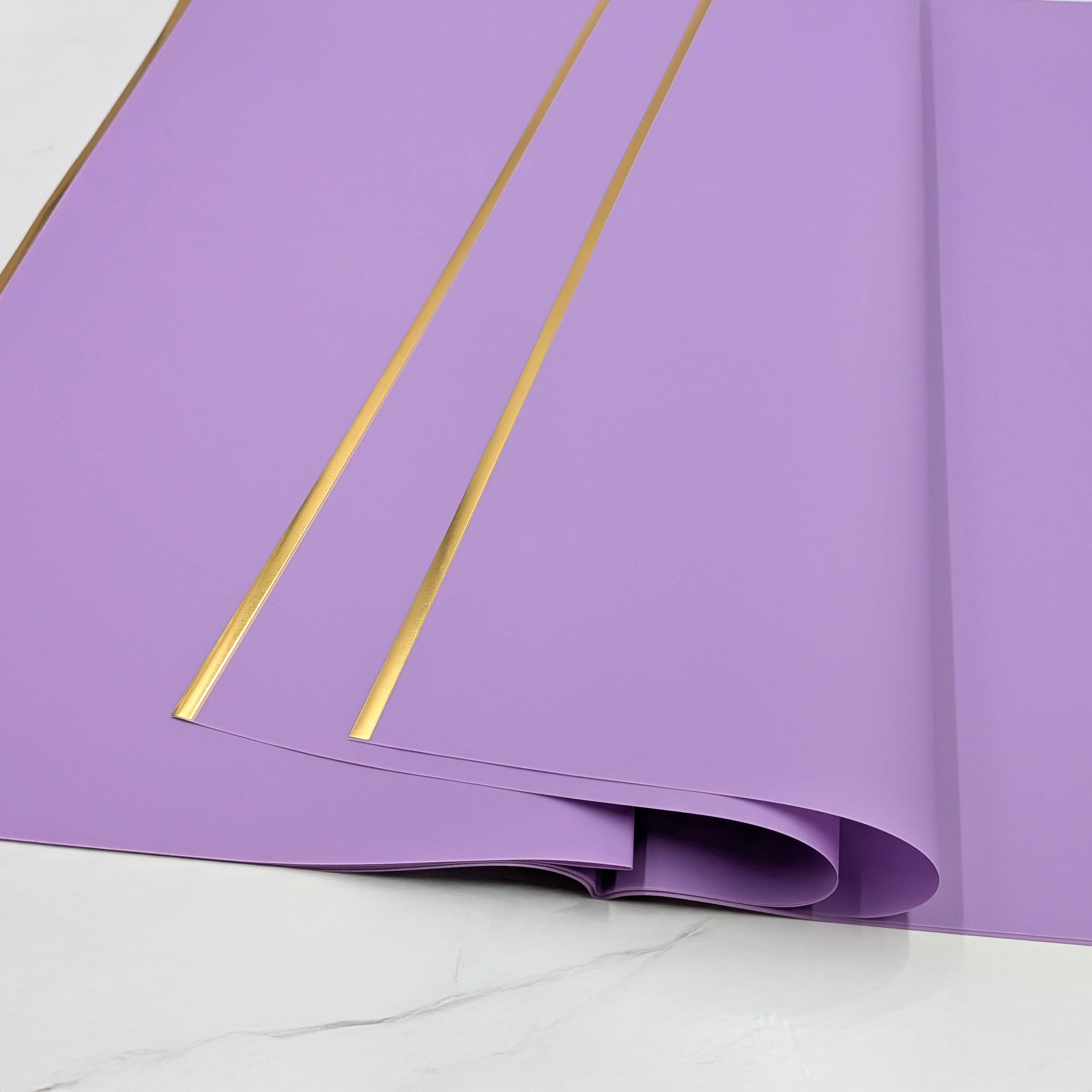 Folia florystyczna w kolorze liliowym to doskonały wybór do tworzenia eleganckich i wyjątkowych kompozycji florystycznych. Jej subtelna przezierność nadaje bukietom delikatności i wyrafinowania, a złoty pasek na obwodzie dodaje całości luksusowego charakteru. Dzięki połączeniu delikatnej barwy liliowej i złotego akcentu, folia ta idealnie komponuje się z różnorodnymi kwiatami, od romantycznych róż po odważniejsze kompozycje.