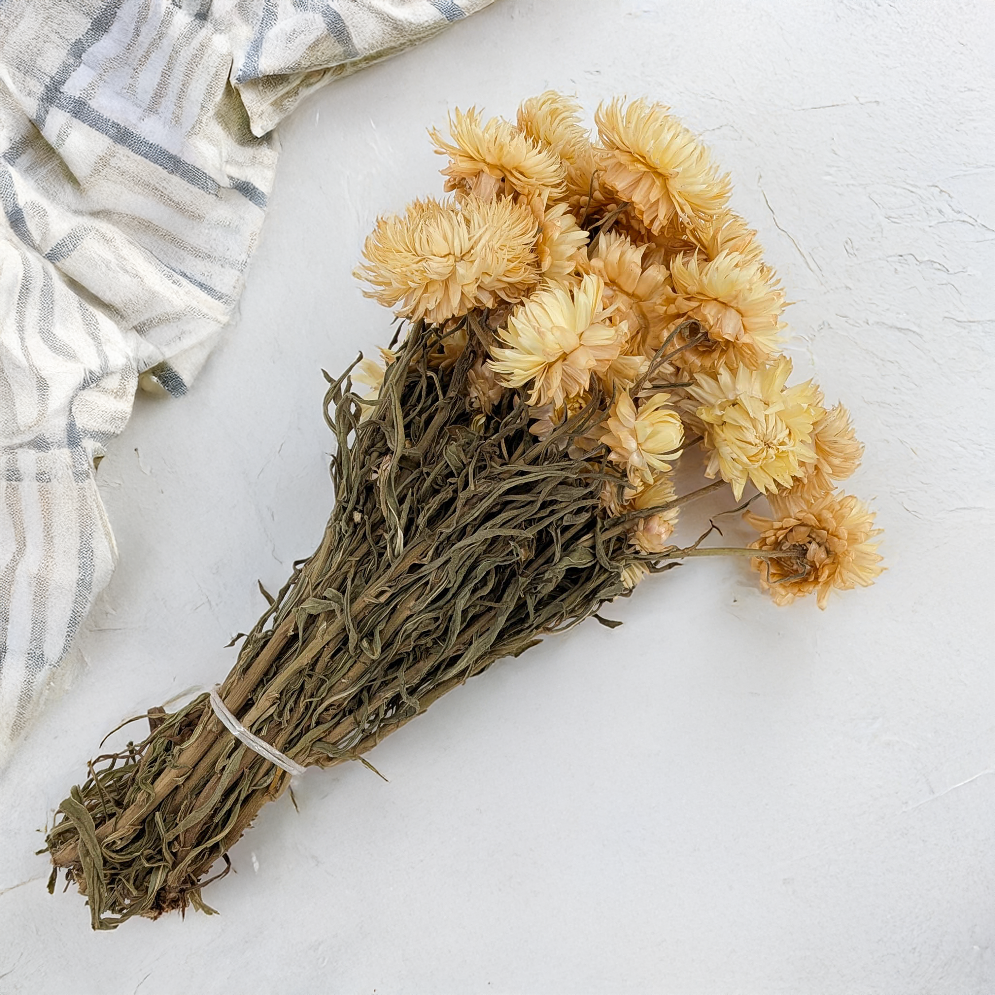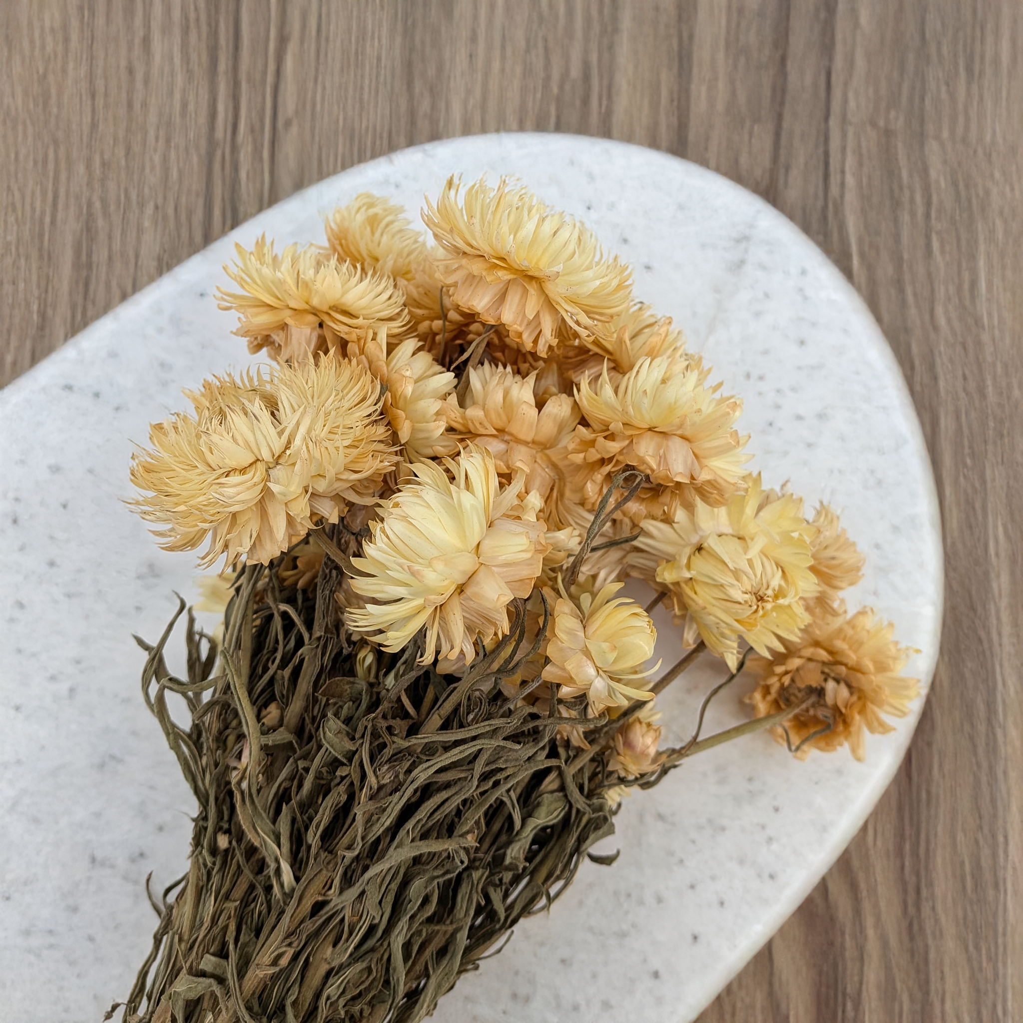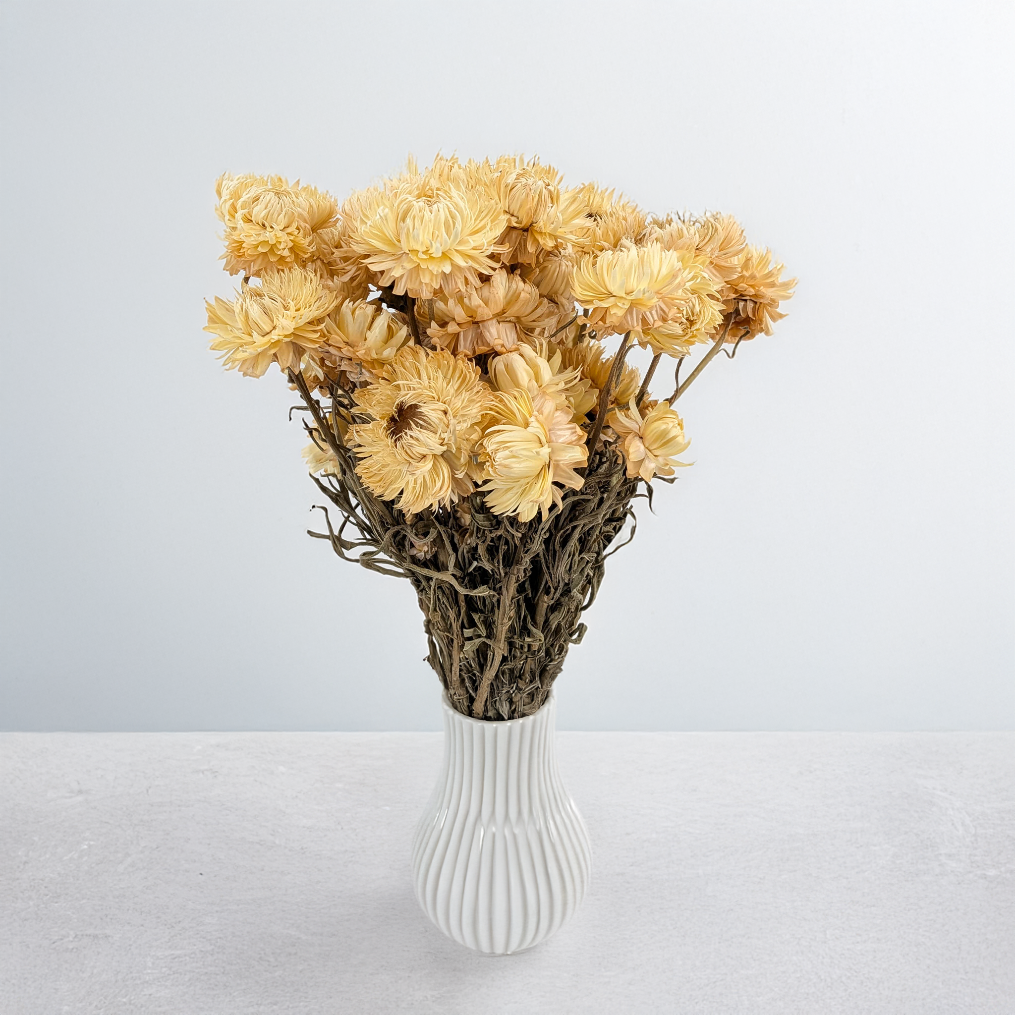 Kolor słomkowy symbolizuje spokój, stabilność i ciepło. Kwiaty te wnoszą do wnętrz harmonię i subtelność, idealnie komponując się z dekoracjami rustykalnymi, skandynawskimi oraz boho. Dzięki procesowi suszenia Helichrysum zachowuje trwałość i naturalny wygląd przez wiele miesięcy.