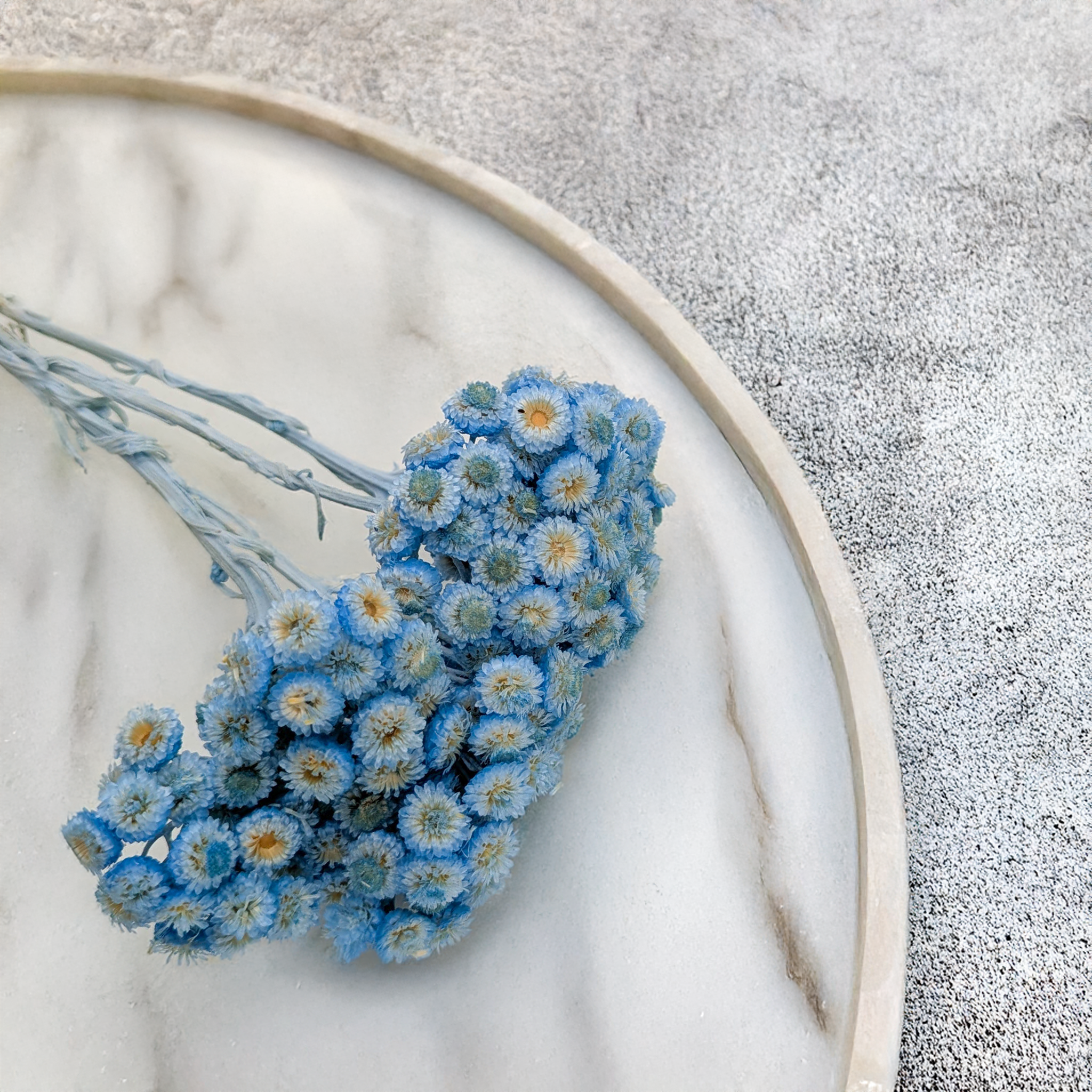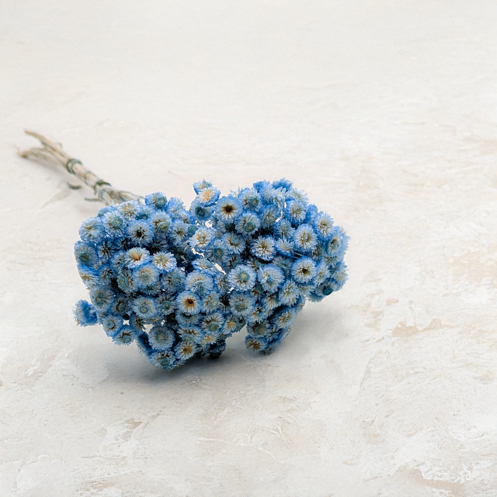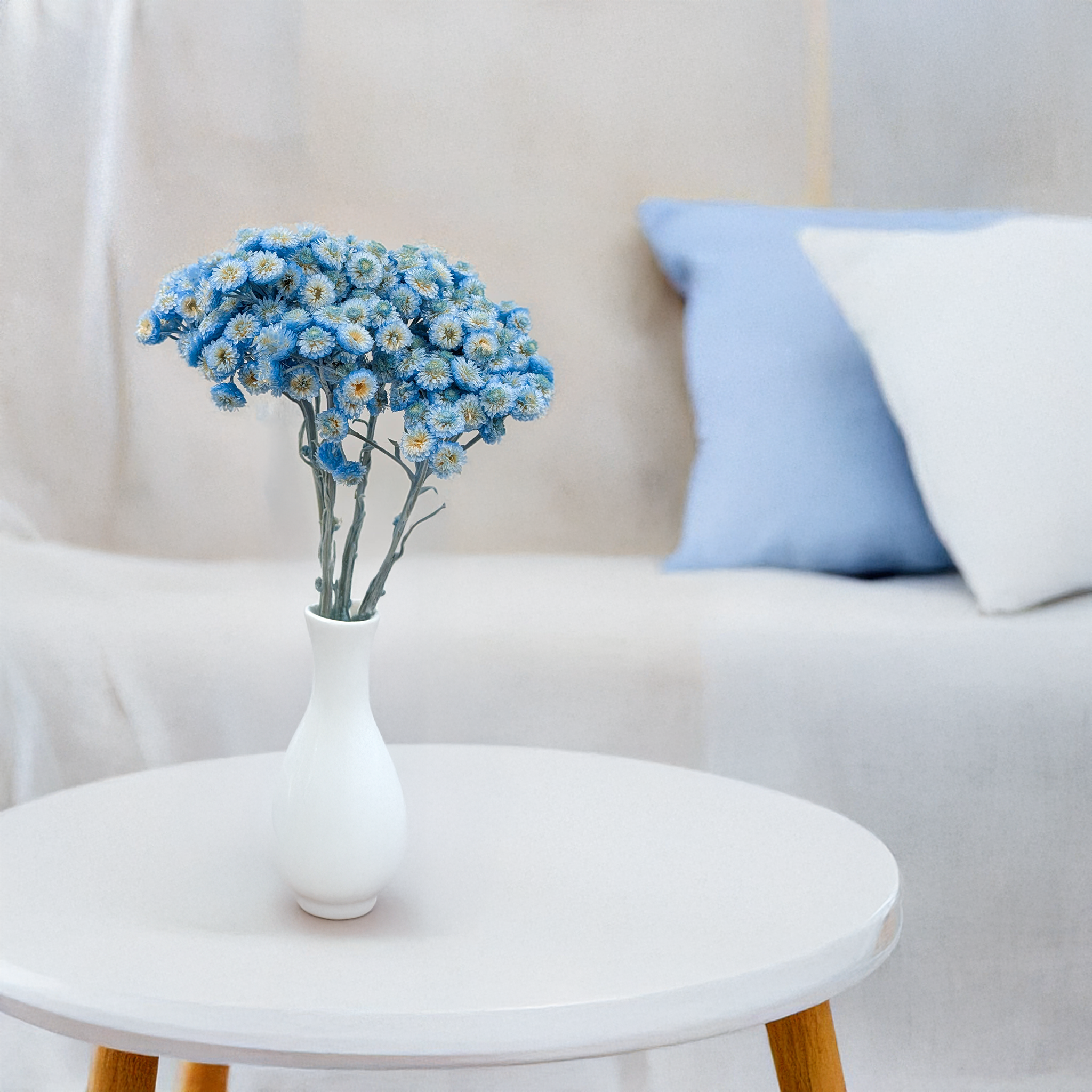 Kocanka włoska suszona w intensywnie niebieskim odcieniu to dekoracyjna roślina o wyjątkowym charakterze. Jej małe, zwarte kwiatostany i delikatne, srebrzyste listki wprowadzają elegancję, świeżość i oryginalność do każdego projektu florystycznego.