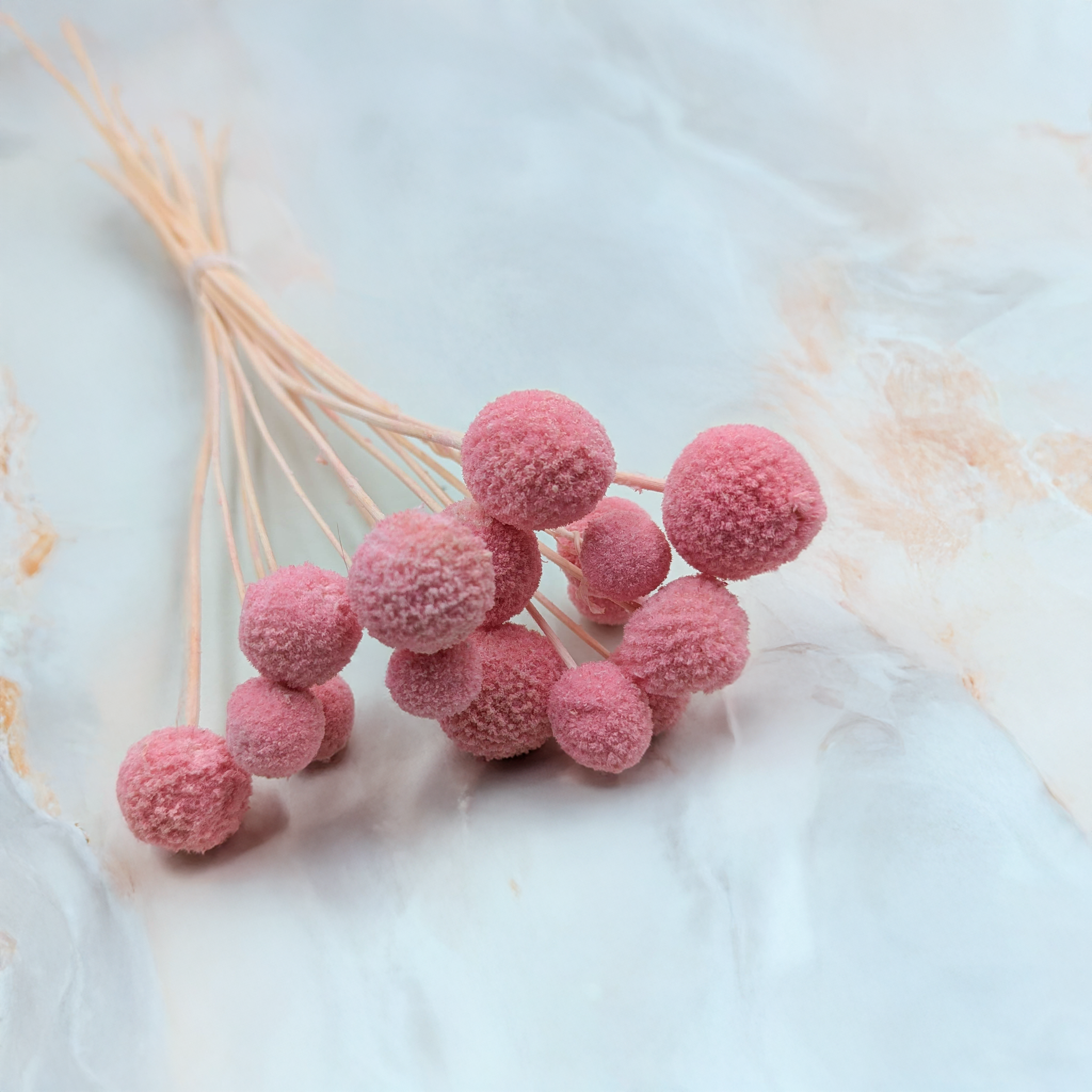 Różowa kraspedia (Craspedia Extra), znana również jako Billy Balls, to zachwycający element dekoracyjny, który wnosi do każdej aranżacji odrobinę optymizmu i koloru. Jej kuliste kwiatostany w intensywnym, nasyconym różu przyciągają wzrok i doskonale komponują się z innymi suszonymi roślinami oraz naturalnymi trawami.