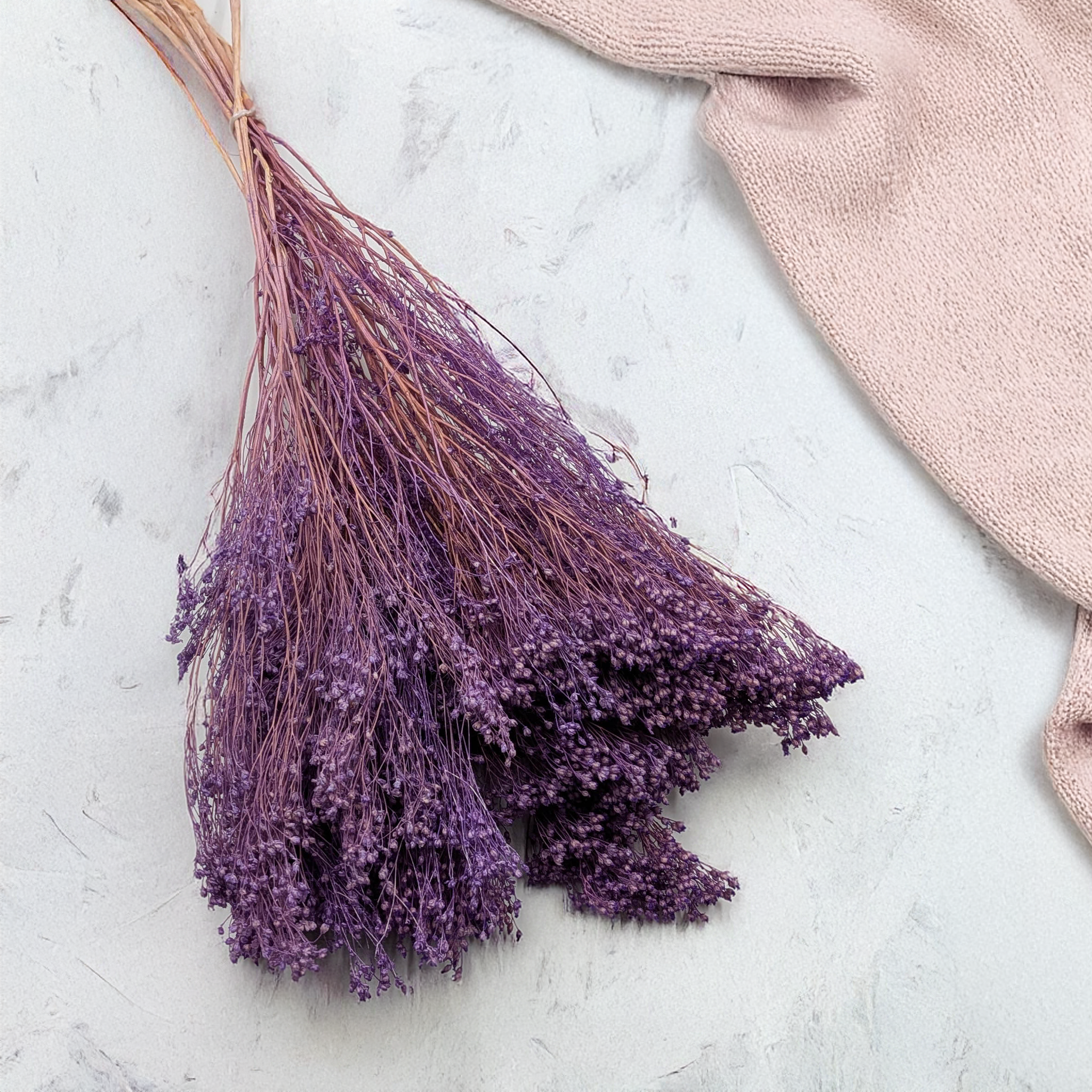 Żarnowiec lawendowy to wyjątkowo dekoracyjna roślina z rodziny bobowatych (Cytisus scoparius), barwiona na subtelny, pastelowy fiolet. Jej puszyste, drobne kwiaty nadają kompozycjom lekkość, świeżość i romantyzm – idealne do stylu boho, rustykalnego i vintage.